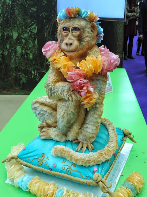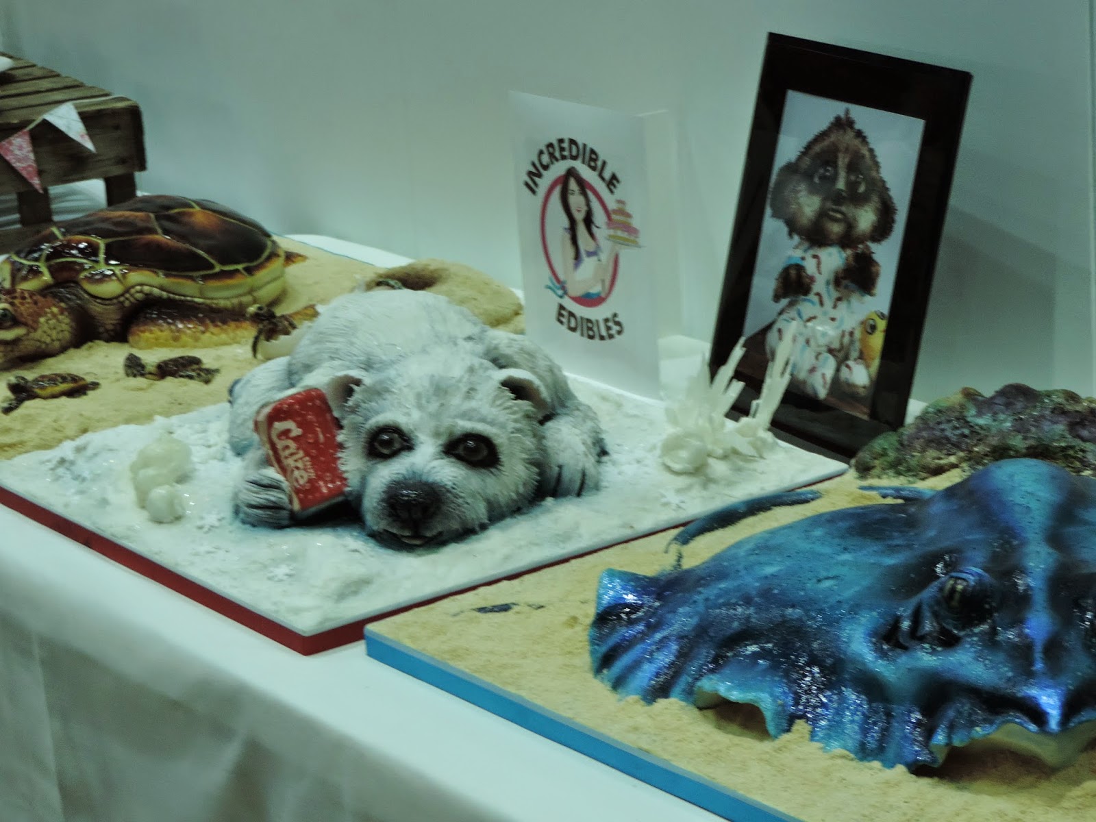 Hello everyone! I have just come back from a wonderful day at The Cake and Bake Show in Manchester with my very good friend Misbah. It has honestly been one of the best days of my life and I highly recommend that you ALL go to the London one later this year or join us for the Manchester show in 2015. I'm currently relaxing with my feet up munching on some cheddar, basil and sundried tomato focaccia. Italian food is my absolute favourite. Yum! Today Misbah and I met not one, not two, not three but FOUR Great British Bake Off contestants from both series 3 and 4 and every single one of them is so lovely and humble, they are some of the nicest people on Earth! Everyone else at the show was so nice too particularly the man at the Yum Yum Tree Fudge stall and all of the girls who were also queuing up with us and so kindly took some photos of me and Misbah with the bakers! As a biologist, I LOVED all of the animal cakes, the peacocks were fabulous. Below are the photos I took and I hope you enjoy salivating at all the extravagant cakes!